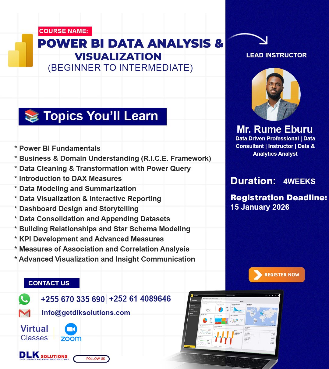 This Course focuses strictly on Power BI as a data analysis and visualization tool. It is designed to build strong, practical Power BI skills from beginner to intermediate level through hands-on learning, replication, and real-world datasets. The emphasis is on using Power BI to connect data, clean data, model data, analyze data, and build dashboards that answer real business and institutional questions, particularly within health-related contexts.
